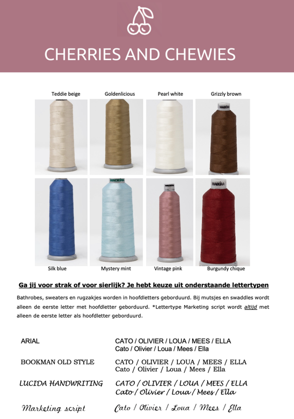 Je kan deze robes door ons laten personaliseren. In ons eigen atelier borduren we alleen met het mooiste garen. We borduren dusdanig dat de naam leesbaar is op de achterzijde van de capes (in hoofdletters).