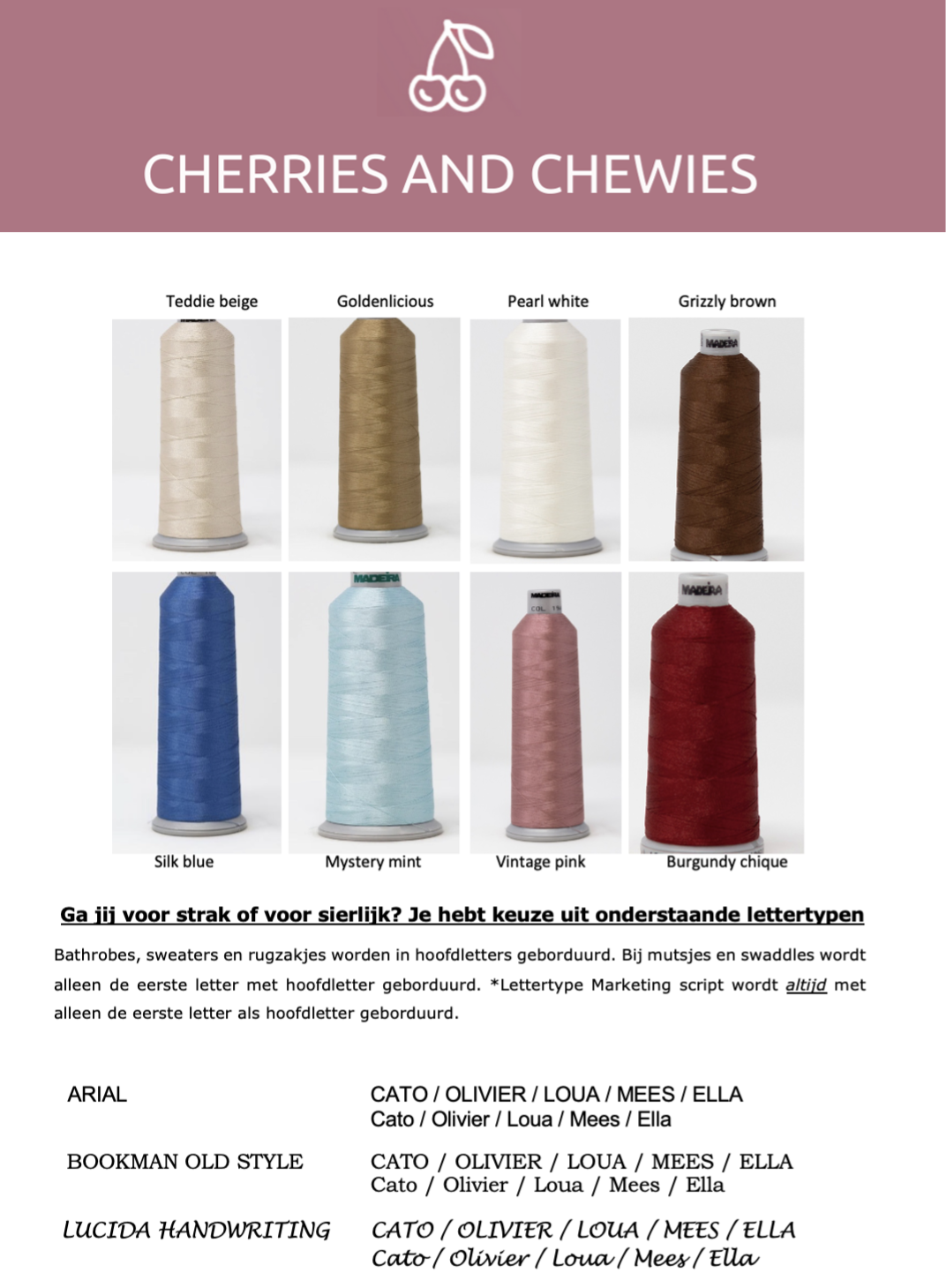 Wij gaan in ons atelier met veel liefde aan de slag voor jou. We kijken per naam wat het áller mooiste past qua borduurformaat. De hoogte van het geborduurde deel zal ongeveer 2,5-4 cm bedragen. Een korte naam zal door ons vanzelfsprekend iets groter worden geborduurd dan een lange naam (Xem vs. Annemarie-Sofie). ;)